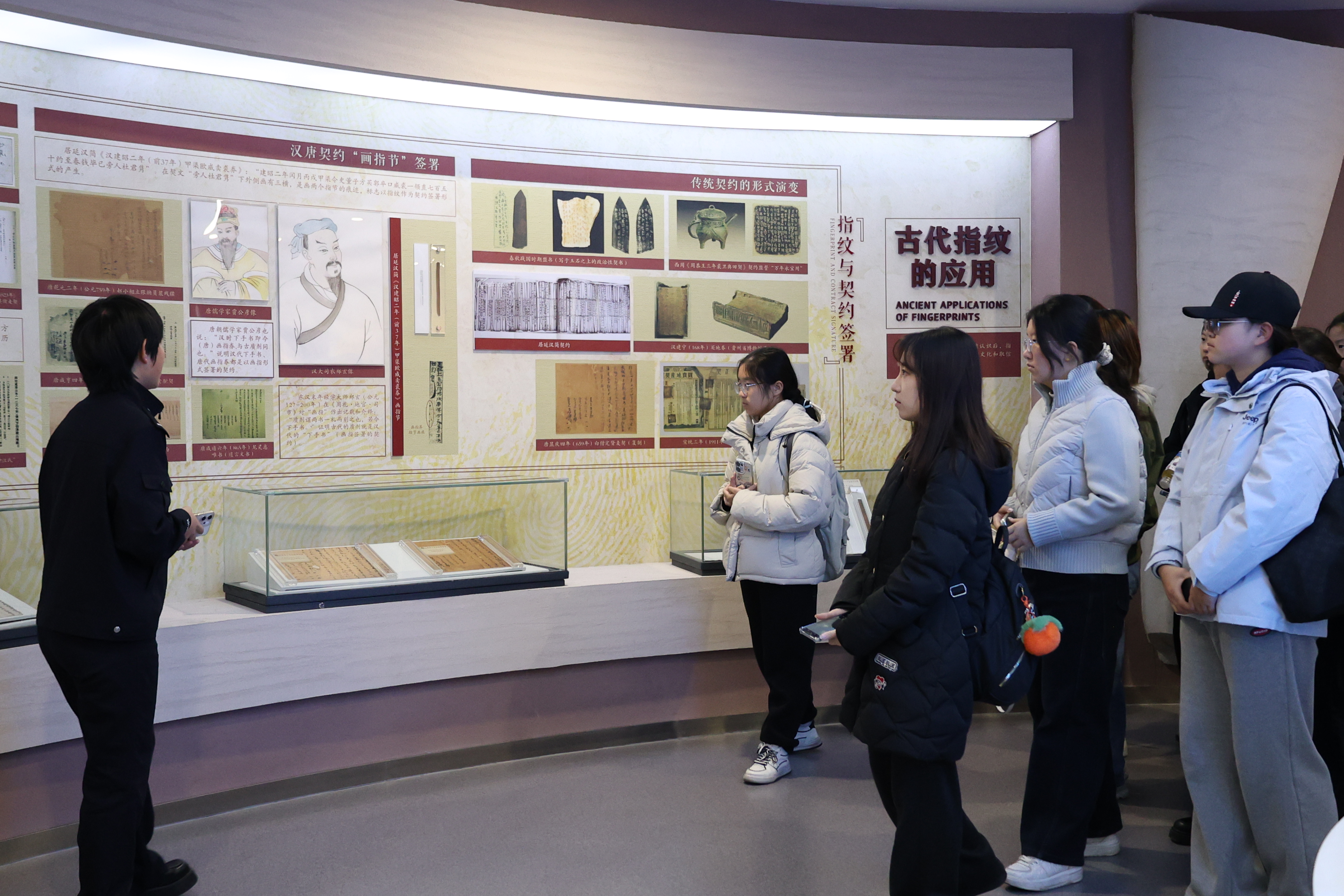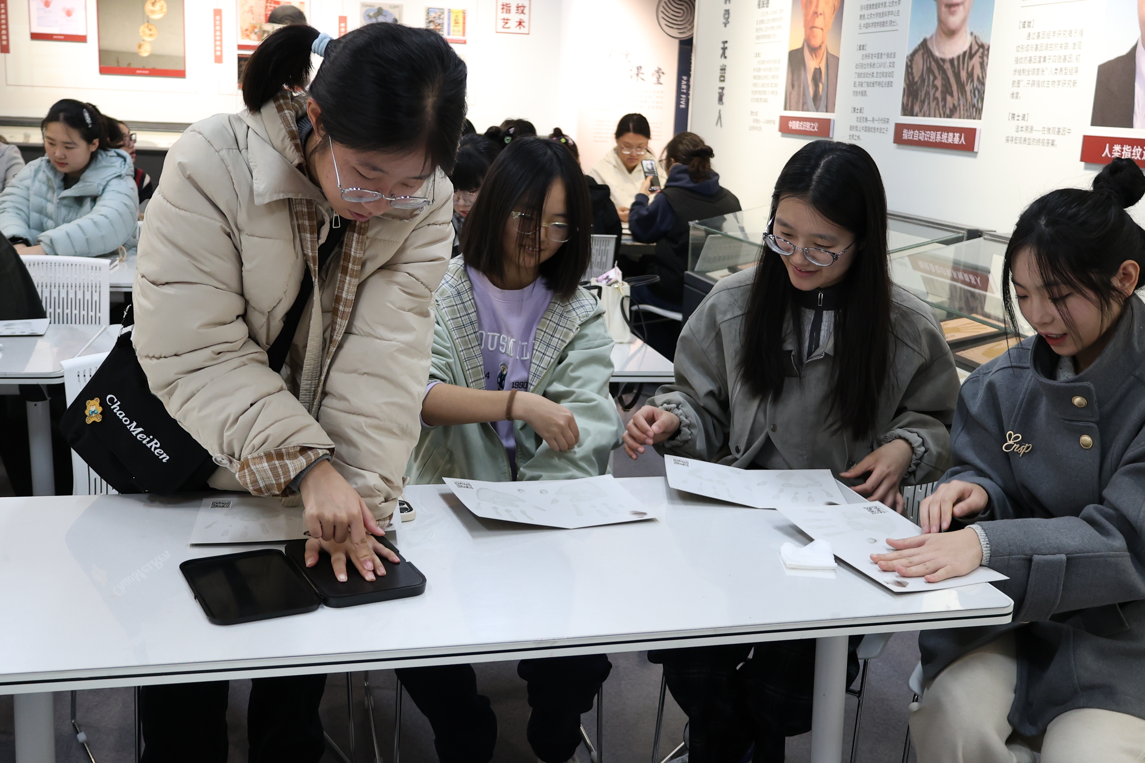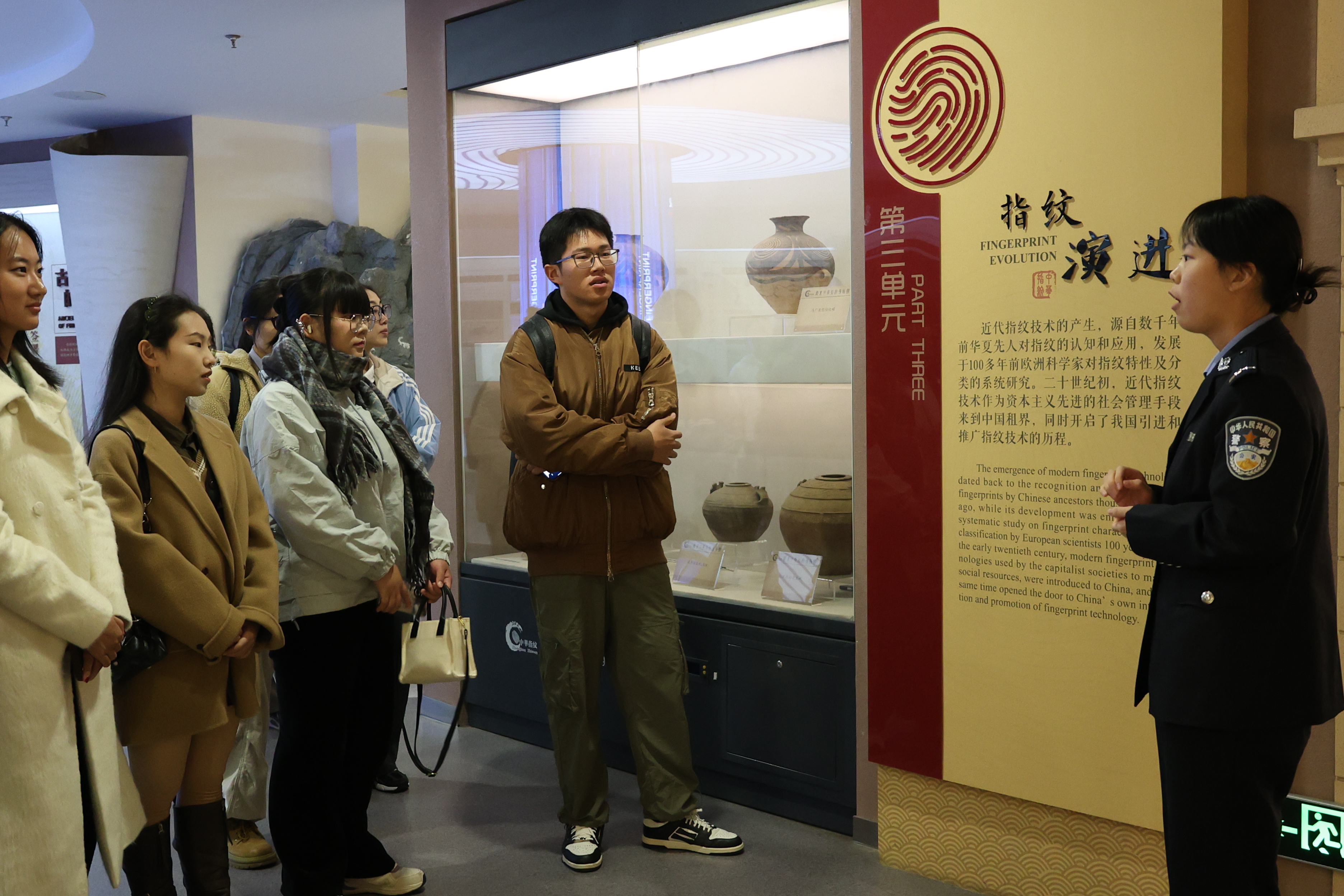 随后,同学们走进图书馆二楼的南京中华指纹博物馆。讲解员同学分享到,江苏警官学院在多年指纹专业研究和教学积淀的基础上,创建了国内唯一以“指纹”为主题的博物馆。除了参观展览、聆听讲解,博助团同学们还在讲解员同学的带领下体验了“指纹显影”实验,将手掌按在纸上,通过墨盘,一个掌印便清晰地呈现在眼前。