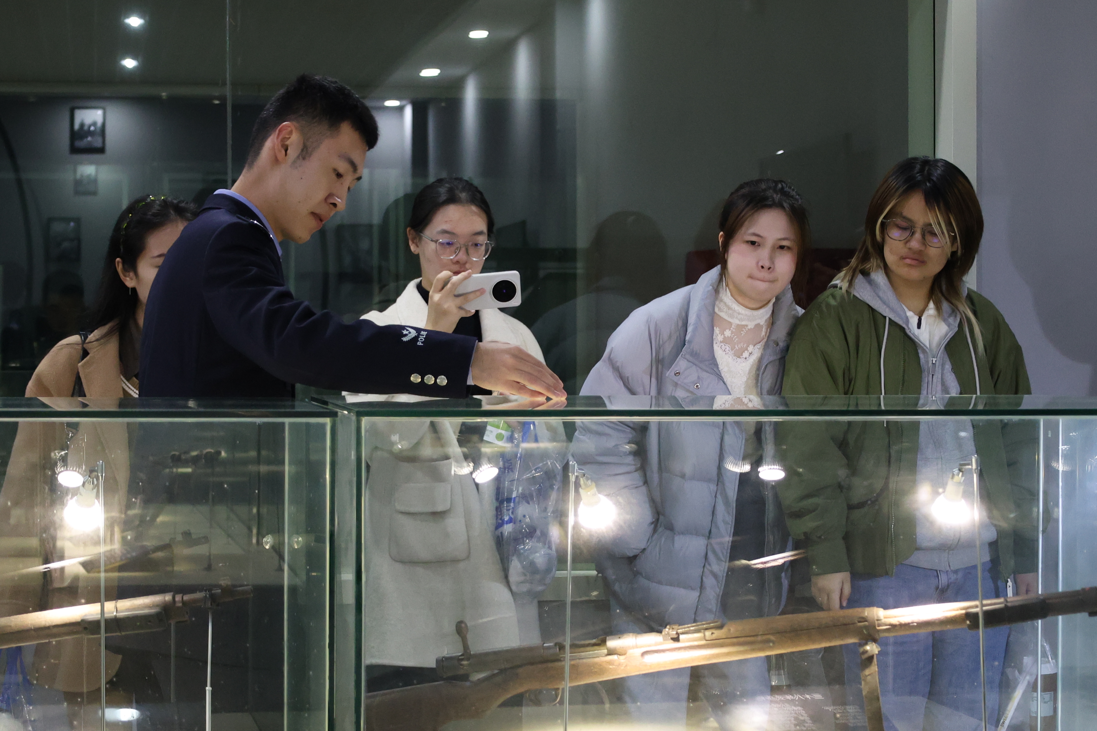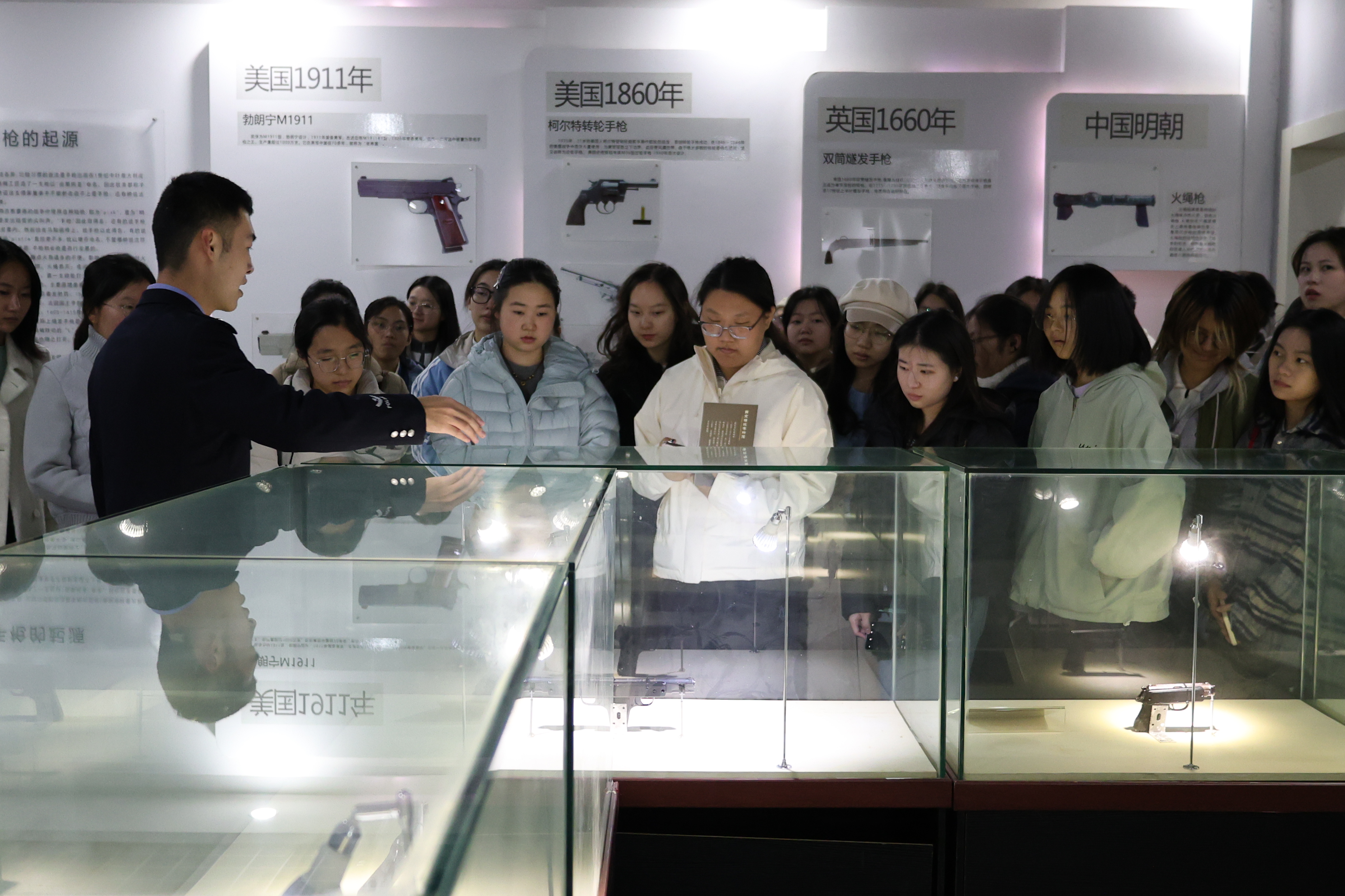 “枪械发展史陈列馆”在枪械发展的专业指导方面填补了公安系统的空白。馆藏枪械实物装备82支,展现了从冷兵器时代到现代化战争枪械装备的发展历程。江警志博团同学将自己日常射击训练保存的子弹壳作为礼物送给到访的同学,并创意地将子弹壳摆成南审英文缩写“NAU”的图案。